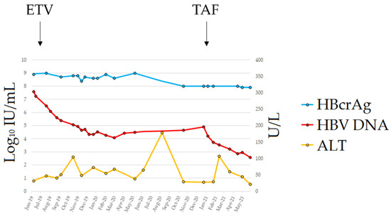 In May 2019, the patient developed chronic myeloid leukemia (CML). Before treatment with imatinib mesylate, the patient repeated the HBV serology and the HBeAg was again detected in his blood in the absence of circulating HBsAg; further testing using a real-time PCR showed that he had HBV DNA in serum at a titer of 26,100,000 IU/mL. The patient was still anti-HBs-positive (15 mIU/mL) with normal liver enzymes. A diagnosis of HBVr was made and, in July 2019, the patient started entecavir (ETV) treatment at 0.5 mg/day, which was subsequently reduced in April 2020 to 0.5 mg/48 h because of renal function deterioration. The patient underwent a close follow-up (every 2 weeks) for the first 6 months of treatment and, after, with monthly scheduling. The therapy led to a consistent decrease in viremia, reaching a plateau of 3 Log10 HBV DNA reduction after 6 months of treatment (Figure 1); however, viremia did not decrease further in the following months. No classic ETV-resistant mutations were observed in the HBV reverse transcriptase (rt) gene. However, we detected the mutation rtL269I, previously reported to confer a reduced susceptibility to ETV [11]. On January 2021, the patient switched to tenofovir alafenamide (TAF) treatment; HBV DNA rapidly declined and reached a value of 378 IU/mL at the last FU. The single ALT elevation (107 U/L) in the 2nd month of TAF treatment was documented in the course of an infection of the residual left limb requiring surgical toileting. Unfortunately, the patient died from coronary heart disease in September 2021.