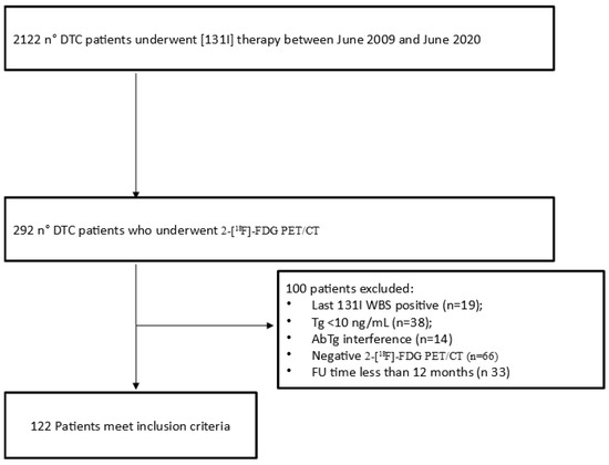 From June 2009 to June 2020, 122 patients who received [131I] therapy for DTC after total or nearly total thyroidectomy were retrospectively screened. They were admitted to our Nuclear Medicine Unit for ablation of the thyroid remnant and/or subsequent [131I] therapy if indicated according to EANM (European Association of Nuclear Medicine) guidelines [22]. Among these patients, we recruited all patients who underwent a 2-[18F]FDG PET/CT scan during the course of the disease. Inclusion criteria were (a) the presence of a positive 2-[18F]FDG PET/CT scan; (b) the presence of a negative [131I]WBS near to the PET/CT; (c) a Tg value ≥ 10 ng/mL at the time of the PET/CT scan; (d) no detectable Tg-antibodies; (e) age higher than 18 years old at the time of PET/CT; (f) follow-up time more than 12 months from PET/CT or until death. Finally, 122 (6%) patients were investigated (Figure 1). The main epidemiological and clinical features of this sample are given in Table 1. All PET/CT scans were performed after more than one radiometabolic treatment and the mean time between the last [131I] therapy and PET/CT was 6 months (range 2–13 months). There was a prevalence of male (n = 67) compared to female (n = 55). Average age was 56 years (range 20–80). The classic variant of papillary carcinoma was the most frequent histotype with 46 cases (38%), followed by follicular carcinoma (20%) and aggressive papillary variants (19%) (15 tall cell variants of papillary carcinoma and 8 sclerosing diffuse variants of papillary carcinoma). The average size of the primary tumor was 35 mm (range 5–90 mm). Considering ATA class risk categories at ablation, 16 (13%) patients were in the low-risk group, 80 (66%) in the intermediate risk-group and 26 (21%) in the high-risk group. Average Tg at ablation was 236 ng/mL (0.1–1001 ng/mL), while at the time of 2-[18F]FDG PET/CT was 165 ng/mL (10–2020 ng/mL).