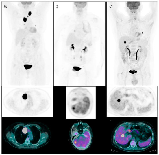 Some examples of DTC patients with positive PET/CT. A patient with mediastinal and thoracic FDG positive disease and the lesion with higher uptake in the upper mediastinum ((a), SUVmax 55). A patient with brain metastases detected by PET/CT with uptake higher than the surrounding brain parenchyma ((b), SUVmax 20). A patient with liver metastases ((c), SUVmax 35).
