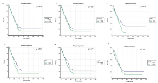 Kaplan–Meier curves relating to PFS and the PET/CT metrics ((a) SUVmax; (b) SUVmean; (c) MTV; (d) TLG; (e) tMTV; (f) tTLG).