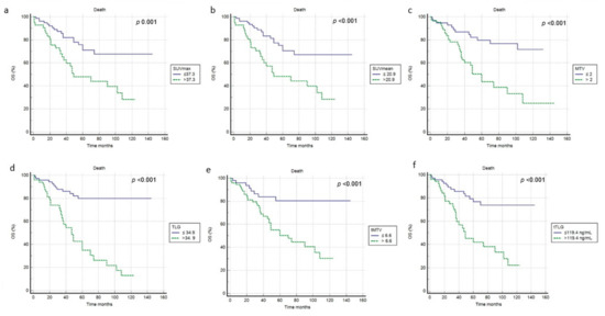 Kaplan–Meier curves relating to OS and the PET/CT metrics ((a) SUVmax; (b) SUVmean; (c) MTV; (d) TLG; (e) tMTV; (f) tTLG).