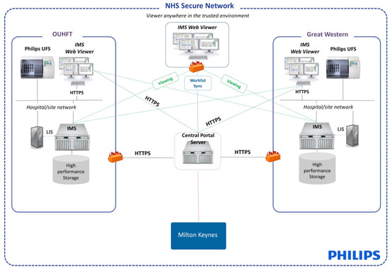 Architecture of solution design—Great Western Hospitals Foundation Trust (GWHFT) and Milton Keynes University Hospital Foundation Trust (MKUHFT) were bought online as part of the piloting of the supraregional network. MKUHFT has the same infrastructure as GWHFT, not shown here for simplicity. OUHFT is the central laboratory.