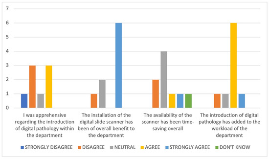 Prior to the commencement of any DP deployment in the central site, we sought to assess the perception of pathologists and the wider multidisciplinary laboratory team who were part of a DP steering group, regarding the transition to DP in respect to their perceptions around potential benefits and challenges. This was part of the effort to engage the group to ensure that the process would be supported. An initial focus group explored the issues [8] and subsequently an online survey was circulated to the 13 members of the DP steering group using the SurveyMonkey survey tool (www.surveymonkey.co.uk; accessed on 13 October 2021). The survey was designed to assess both general considerations related to the transition to DP, and more focused questions addressing the predicted ‘benefits’ of adoption of DP.