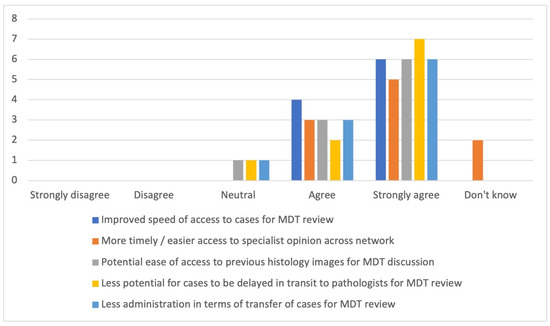 There were 10 respondents to the survey: three histopathologists, three oncologists, two MDT co-ordinators, one radiologist, and one specialist nurse. All but one (of 10) were aware of the introduction of DP at OUHFT, and all regarded this as a positive step. The overall opinion was entirely positive in regard to the potential benefit from DP in relation to the ease of access to specialist opinion and for the review of cases, and to the speed of access and the potential for a reduction in administrative burden (see Figure 3).