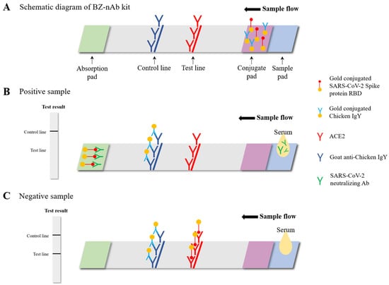 The BZ-nAb is an immunochromatographic assay involving two components: the Gold conjugated SARS-CoV-2 S protein RBD and the ACE2 receptor. For internal control, Gold conjugated Chicken IgY and goat anti-chicken IgY are included (Figure 1A). The BZ-nAb detects SARS-CoV-2 nAbs by detecting the inhibition of the RBD-ACE2 interaction by nAbs in the sample (Figure 1B,C).