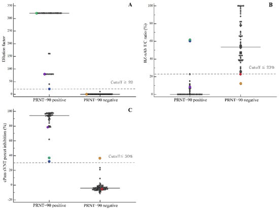 Comparisons between PRNT-90-positive and -negative groups with respect to the distributions of dilution factor for PRNT-90, T/C ratio for the BZ-nAb, and percent inhibition for the cPass sVNT are shown in Figure 2. For PRNT-90-positive and -negative groups, the median T/C ratios were 0% and 53.5%, and the median percentage inhibition was 94.2% and −4.2%, respectively. Among the PRNT-90-positive samples, three samples were false-negatives according to the results of visual interpretation of BZ-nAb (Figure 2 and Figure S2A, green, blue, and purple dots), and two samples were also false-negatives when interpreted using the T/C ratio cutoff (Figure 2 and Figure S2A, blue and green dots). These two false-negative samples showed PRNT-90 titers of 1:20 and above 1:320 and were positive for cPass sVNT with relatively low cPass sVNT percentage inhibition values (31.2% and 36.1%, respectively). One PRNT-90 negative sample was a false-positive according to both the BZ-nAb using T/C ratio cutoff and the cPass sVNT; however, this sample was negative according the BZ-nAb visually interpreted result (Figure 2 and Figure S2B, orange dot). The dilution factor of PRNT-90 was more strongly correlated with cPass sVNT percent inhibition than with the T/C ratio of the BZ-nAb (r = 0.8660 vs. r = −0.7089; both p < 0.001).