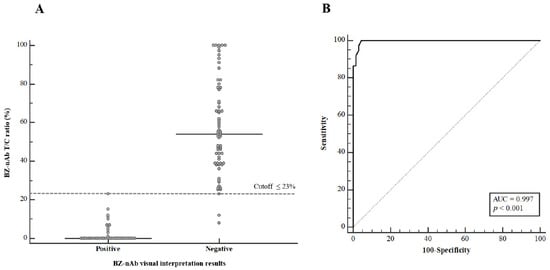 Comparison of the T/C ratio-interpreted and visually interpreted results of the BZ-nAb test. (A) Data distribution of BZ-nAb visually interpreted results. The horizontal dashed line indicates the cutoff selected using the receiver operating characteristic (ROC) analysis. (B) The ROC curve for the T/C ratio results, compared to the visually interpreted results. The area under the curve (AUC) values are also presented.