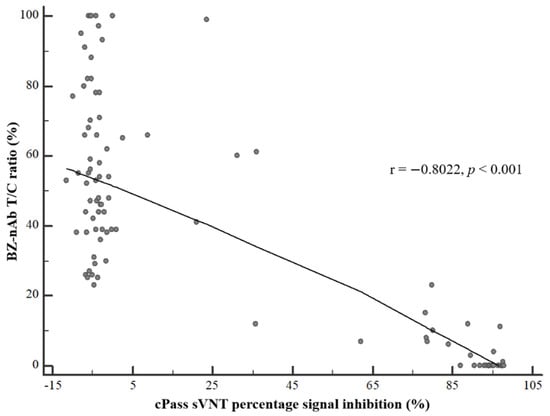 Correlation between the BZ-nAb T/C ratio and cPass sVNT percent inhibition. Pearson’s correlation analysis showed a strong negative correlation between BZ-nAb T/C ratio and cPass sVNT percent inhibition (r = −0.8022, p < 0.001) when analyzed using a total of 101 samples.