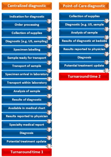 Reduction of turnaround time is another benefit of POC testing. The use of blood gas analysers is a prototype of a simple POC diagnostic drastically reducing turnaround time and resulting in a better control of ventilation, electrolytes and acid-base disorders [22]. Even if continuous pulse oximetry and capnometry could reduce need for blood gas analysis, the discrepancy in results of capnometry (end tidal CO2) and blood gas analysis (PaCO2) in critically ill patients can be disastrous if unrecognized, especially in neurosurgical patients [22,23,24,25,26,27]. Turnaround time for blood gas analysis was significantly longer if done in a centralised laboratory (27.3 min), in comparison to POC approach (6.8 min). In the case of electrolytes analysis, the turnaround time was 95 min if done in a laboratory, and only 7.1 min in the case of POC (Figure 1) [14].