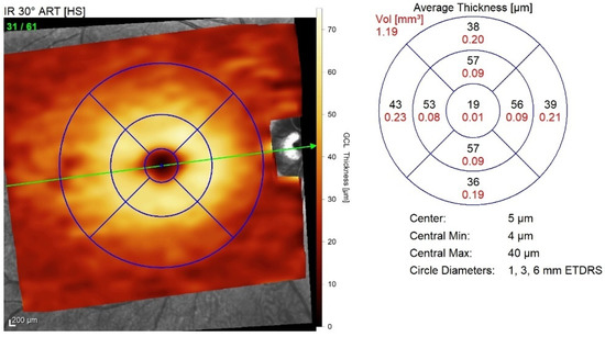 A GCL thickness map was created and analysed using the early treatment of diabetic retinopathy study (ETDRS) retinal grid. The map was divided into nine ETDRS macular fields. The average thickness of each area was expressed in microns, and the total volume was expressed in mm3 (Figure 2).