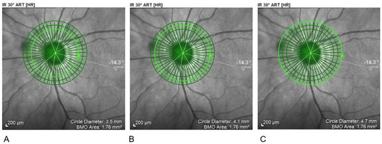 Circular scanning areas for pRNFL. (A) 3.5 mm; (B) 4.1 mm; (C) 4.7 mm. pRNFL, peripapillary Retinal Nerve Fiber Layer examination.