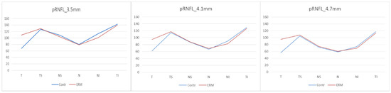 Peripapillary Retinal Nerve Fiber Layer. (pRNFL) thicknesses at 3.5 mm, 4.1 mm and 4.7 mm. Contr, Control group; ERM, Epiretinal membrane group; pRNFL, Peripapillary Retinal Nerve Fiber Layer; T, Temporal sector; TS, Temporal superior sector; TI; Temporal inferior sector; N, Nasal sector; NS, Nasal superior sector; NI; Nasal inferior sector.