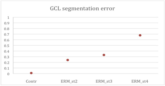Ganglion Cell Layer (GCL) segmentation error percentages per group. Contr. Control group; ERM_st2. Epiretinal membrane group stage 2; ERM_st3. Epiretinal membrane group stage 3; ERM_st4. Epiretinal membrane group stage 4.