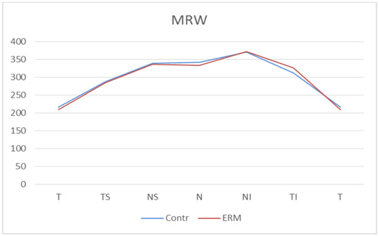 Bruch’s Membrane Opening Minimum Rim Width (MRW) thicknesses. Contr, Control group; ERM, Epiretinal membrane group; T, Temporal sector; TS, Temporal superior sector; TI, Temporal inferior sector; N, Nasal sector; NS; Nasal superior sector; NI, Nasal inferior sector.