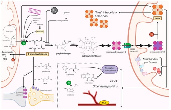 The pathway leading to the biosynthesis of heme is inscribed into a complex network of interactions that also includes some of the most fundamental processes of basal metabolism. Therefore, a disruption in any of the steps of this pathway is likely to interfere in a pleiotropic fashion with the viability of cells and tissues, thus giving rise to multiple possible mechanisms of pathogenesis (Figure 1). Here, we have endeavored to outline the (sometimes contradictory) evidence that has been gathered to date, regarding the mechanisms of neurotoxicity in acute hepatic porphyrias.