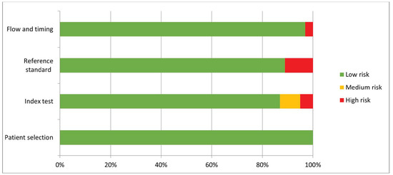 - Whiting, P.F.; Rutjes, A.W.S.; Westwood, M.E.; Mallett, S.; Deeks, J.J.; Reitsma, J.B.; Leeflang, M.M.; Sterne, J.A.; Bossuyt, P.M.; QUADAS-2 Group. QUADAS-2: A Revised Tool for the Quality Assessment of Diagnostic Accuracy Studies. Ann. Intern. Med. 2011, 155, 529–536. [Google Scholar] [CrossRef] [PubMed]