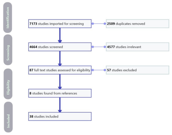 We included a total of 38 studies [13,14,15,16,17,18,19,20,21,22,23,24,25,26,27,28,29,30,31,32,33,34,35,36,37,38,39,40,41,42,43,44,45,46,47,48,49,50] in our systematic review. The QUADAS-2 tool is presented in Figure 1, and a PRISMA flowchart of the literature search is presented in Figure 2.