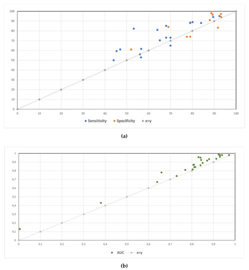 Visual summaries of the performance change in sensitivity, specificity, and AUC for all studies are shown in Figure 3a,b.