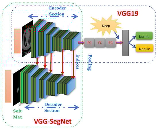 Evaluation of the shape and dimension of the abnormality in medical images is widely preferred during the image-supported disease diagnosis and treatment implementation process [,]. Automated segmentation is widely used to extract the infected section from the test image and the mined fragment is further inspected to verify the disease and its severity level. In the assessment of the lung nodule with CT images, the dimension of the lung nodule plays a vital role and, therefore, the extraction of the nodule is very essential. In this work, the VGG-SegNet scheme is implemented with the VGG19 scheme to extract the CT image nodule. Information on the traditional VGG-SegNet model can be found in [].