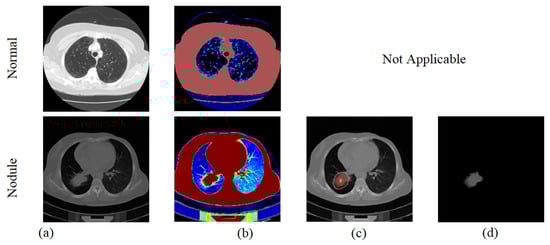 This section demonstrates the results and discussions attained using a workstation with an Intel i5 2.5GHz processor, with 16GB RAM and 2GB VRAM equipped with MATLAB® (version R2018a). Primarily, lung CT images are used as presented in Table 2 and then each image is resized into pixels to perform the VGG19-supported segmentation and classification task. Initially, the VGG-SegNet-based lung nodule extraction process is executed on the test images considered, and the sample result obtained for the normal/nodule class image is represented in Figure 4. Figure 4 presents the experimental result of the trained VGG-SegNet with CT images. Figure 4a shows the sample images of the normal/nodule class considered for the assessment; Figure 4b depicts the outcome attained with the final layer of the encoder unit; Figure 4c,d depicts the results of the decoder and the SoftMax classifier, respectively. For the normal (healthy) class image, the decoder will not provide a positive outcome for localization and segmentation, and this section will provide the essential information only for the nodule class.