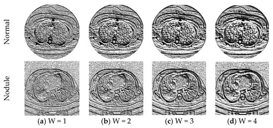 After collecting the essential DF with VGG19, the other HCFs, such as GLCM, LBP and PHOG are collected. The GLCM features for the normal (healthy) class image are collected from the whole CT image, and for the abnormal class image it is collected from the binary image of the extracted nodule segment. Figure 7 shows the LBP patterns generated for the normal/nodule class test images with various weight values. During LBP feature collection, each image is treated with the LBP algorithm with various weights (ie, W = 1 to 4) and the 1D features obtained from each image are combined to obtain a 1D feature vector of dimension .