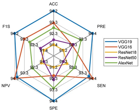Figure 3 presents the assisted classification of using the VGG19 of lung CT images (dimension 224 × 224 × 3 pixels) using the DF using the SoftMax classifier, and then the performance of VGG19 is validated with VGG16, ResNet18, ResNet50 and AlexNet (images with dimension of 227 × 227 × 3 pixels) [,,,,,] and the performance is compared and validated. The performance of the implemented VGG19 is validated using DF, concatenated DF + HCF and well-established binary classifiers existing in the literature [,,,].