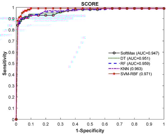 The experiment is then repeated using the VGG19 scheme with the DF + HCF (1 × 1540 features) using classifiers, such as SoftMax, DT, RF, KNN and SVM-RBF; the outcomes are depicted in Table 5. Figure 10 shows the performance of VGG19 with SVM-RBF, in which a 10-fold cross validation is implemented and the best result attained among the 10-fold validation is demonstrated. The result demonstrated in Table 5 confirms that the SVM-RBF classifier offers superior outcome contrast to other classifiers and a graphical illustration in Figure 11 (Glyph-Plot) also confirmed the performance of SVM-RBF. The Receiver-Operating-Characteristic curve (ROC) presented in Figure 12 also confirms the merit of proposed technique.
