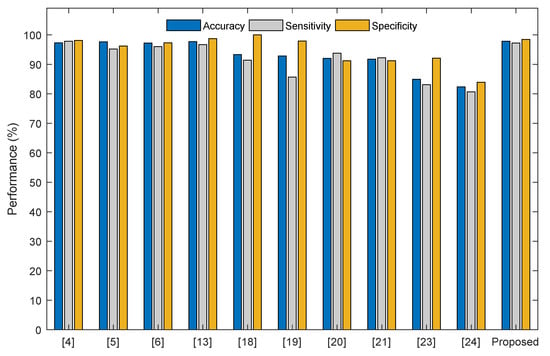 The overall eminence of the proposed method is validated by computing the essential IPV measures, such as True-Positive (TP), False-Negative (FN), True-Negative (TN), False-Positive (FP), Accuracy (ACC), Precision (PRE), Sensitivity (SEN), Specificity (SPE), Negative-Predicted-Value (NPV), F1-Score (F1S), Jaccard Index and Dice coeeficient, which are calculated in percentages, presented in Equations (11)–(16). The necessary information regarding these values can be found in [,,].