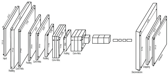 The two drop-out layers consisted of 4096 filters, kernel size of 7 × 7 and stride size 1 × 1. Following the drop-out layers, a convolution layer was used to decrease the number of output channels with 1 × 1 kernel size and 1 × 1 stride size. To resize the feature maps into the same padding images and predict each pixel while keeping the spatial information intact in both the original images and the upsampled feature maps, a deconvolutional layer with the configuration of 64 × 64 kernel size and stride size 1 × 1 is used. A cropping operation was performed after the deconvolution layer to fit the input size.