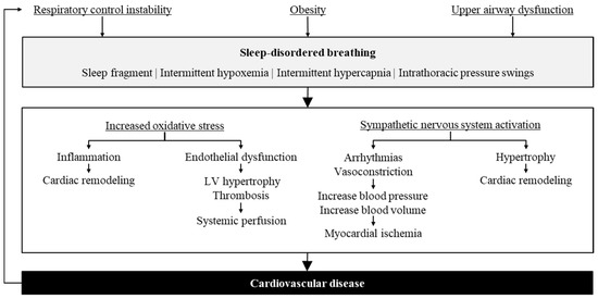 Pathophysiological consequence of sleep-disordered breathing and cardiovascular disease. LV = left ventricular.
