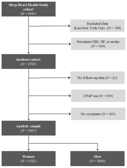 - Gottlieb, D.J.; Yenokyan, G.; Newman, A.B.; O’Connor, G.; Punjabi, N.M.; Quan, S.F.; Redline, S.; Resnick, H.E.; Tong, E.K.; Diener-West, M.; et al. Prospective study of obstructive sleep apnea and incident coronary heart disease and heart failure. Circulation 2010, 122, 352–360. [Google Scholar] [CrossRef]