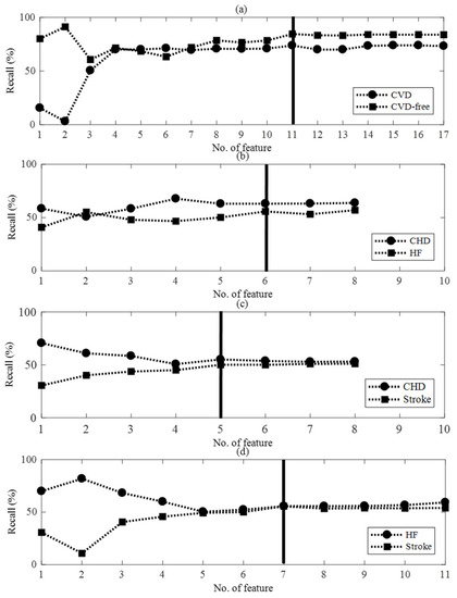 The classification performance according to number of features for feature selection. (a) CVD and CVD-free, (b) CHD and HF, (c) CHD and stroke, and (d) HF and stroke.