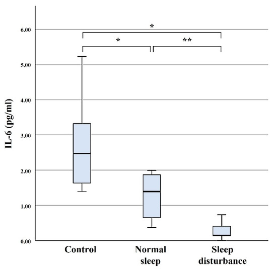 - Wang, M.; Wei, J.; Yang, X.; Ni, P.; Wang, Y.; Zhao, L.; Deng, W.; Guo, W.; Wang, Q.; Li, T.; et al. The level of IL-6 was associated with sleep disturbances in patients with major depressive disorder. Neuropsychiatr. Dis. Treat. 2019, 15, 1695–1700. [Google Scholar] [CrossRef] [PubMed] [Green Version]