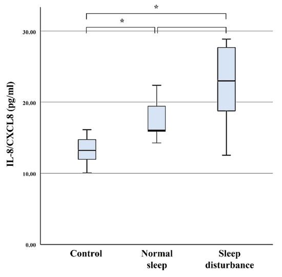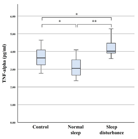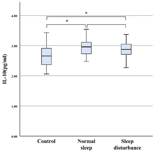 Sleep regulation is complex and is associated with changes in the expression of numerous molecules that are directly involved in sleep [11,12,13,14,15]. Sleep disturbance has been associated with changes in cytokines, which are molecules used for intercellular communication by the immune system. Emerging evidence suggests that sleep disturbance can sensitize or dysregulate inflammatory pathways [16]. Furthermore, previous studies have demonstrated that sleep disturbance in various diseases is associated with altered serum levels of sleep-related cytokines including IL-1, IL-2, IL-6, IL-8, IL-10, and TNF-α [16,17,18,19,20,21,22,23]. These cytokines are also involved in inflammatory, anti-inflammatory, and pain pathways.