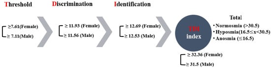 The examiner always wore odourless gloves (e.g., made from cotton) and changed them for each participant. When testing, the cap of only one pen was removed. For testing, the opened odour pen is held 2 cm centered in front of both nostrils and the patient is asked to smell, e.g., using the word “attention”. Each pen should not be presented for more than 3–4 s. The interval between the different presentations was around 30 s. The odour pen did not touch the patient’s skin during the smell presentation. The participants were instructed not to have anything but water for at least 15 min before the test. They were asked to refrain from consuming chewing gum, sweets, or cigarettes. The testing sessions were held in a quiet and well-ventilated room. During the briefing session, participants were asked about their occupational background, gender, age, medical history, drug use, and smoking habits. Participants received no unintentional hints about the correctness of their decisions []. The result of this test is expressed as the sum of the results of the 3 subtests, the so called TDI score (threshold, discrimination, identification) (Figure 1). Here, a score of more than 30 rates as normal, a score of 30 or less indicates hyposmia, and a score of 15 and below points to functional anosmia in the form of a complete loss of the sense of smell or an extremely weakened smell ability (Figure 1). The Greek-validated version [] of the test was administered by replacing certain words to accommodate for cultural appropriateness. The norms for female and male participants, which are over >55 years of age, are shown per olfactory test in Figure 1, as well as the overall thresholds for the TDI index.