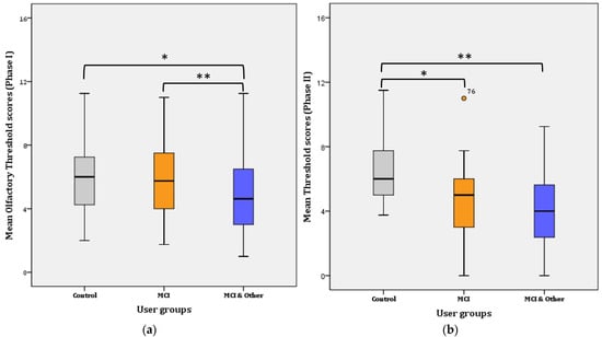 Mean Threshold scores per user group: (a) for Phase I; * for Control–MCI, p = 0.014, ** for Control–MCI & Other, p < 0.001. (b) for Phase II; * for Control–MCI, p < 0.001, ** for Control–MCI & Other, p < 0.001.