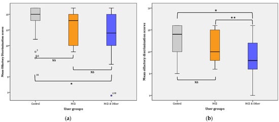 Mean olfactory discrimination scores: (a) for Phase I; * p < 0.001. (b) for Phase II; * p < 0.001, ** p = 0.016. NS: non-significant.