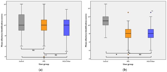 Mean olfactory identification scores: (a) for Phase I; for Control–MCI & Other, * p < 0.001. (b) for Phase II; for Control–MCI and Control–MCI & Other, * p < 0.001, NS: non-significant.