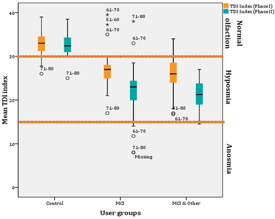 If we age-stratify the TDI scores, according to norms as they have been refined by Oleszkiewicz and colleagues [], they are the following: (a) 51–60 years old: 32.85, (b) 61–70 years old: 31.26, (c) 71–80 years old: 27.93, and (d) >81 years old: 23.30. These are the norms and, below those, people are classified as ‘hyposmic’. Across all age groups, participants are categorised as ‘functional anosmics’ when their mean TDI index is below 16. The MCI and MCI & Other groups’ mean TDI indexes are below the norm across all age-strata, whereas the control group is above the norms for most phases and age clusters (Figure 6).