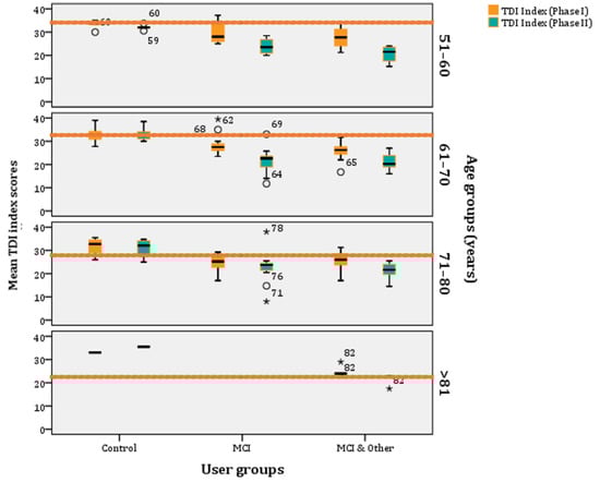 Age–stratified mean TDI index scores per experimental group (* stands for outliers).