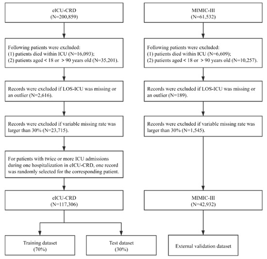 - Verburg, I.W.M.; Atashi, A.; Eslami, S.; Holman, R.; Abu-Hanna, A.; de Jonge, E.; Peek, N.; de Keizer, N.F. Which models can I use to predict adult ICU length of stay? A systematic review. Crit. Care Med. 2017, 45, e222–e231. [Google Scholar] [CrossRef] [PubMed]