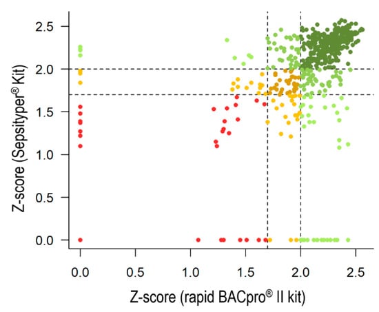 3.2. Comparison between the Rapid BACpro® II Kit and Sepsityper® Kit