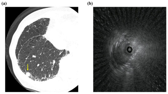 - Yoshikawa, M.; Sukoh, N.; Yamazaki, K.; Kanazawa, K.; Fukumoto, S.-I.; Harada, M.; Kikuchi, E.; Munakata, M.; Nishimura, M.; Isobe, H. Diagnostic Value of Endobronchial Ultrasonography With a Guide Sheath for Peripheral Pulmonary Lesions Without X-Ray Fluoroscopy. Chest 2007, 131, 1788–1793. [Google Scholar] [CrossRef] [PubMed]