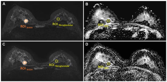 For both sequences, a single region of interest (ROIlesion, size 30–50 mm2; Figure 1) was manually drawn by two radiologists (S.P. and L.C., with 5 and 3 years of experience) on the slice with the largest cross section of the lesion on the b = 1000 s/mm2 images for the signal intensity measurement of lesions (SIlesion). In addition, another ROI (size 50 mm2) was drawn manually in the anterior area outside of the breast to measure background noise signal intensity (SInoise).