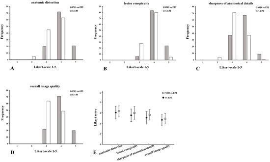 Histogram of the evaluation of image quality: anatomic distortion (A), lesion conspicuity (B), sharpness of anatomical details (C) and overall image quality (D) using Likert scoring; mean values and standard deviation of quality scores (E). Comparison of SMS rs-EPI sequence and rs-EPI sequence.