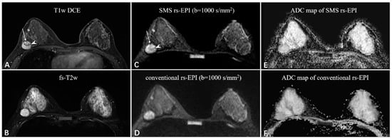 With the development of the rs-EPI sequence, the sensitivity for detecting breast lesion was much improved due to its high contrast between tumors and healthy tissues [13,34]. Compared to ss-EPI, rs-EPI based on the segmentation of k-space can shorten the echo spacing and the echo train duration, thereby reducing phase-encoding distortion artifacts and T2* blurring [21,35]. Previous studies demonstrated that the use of rs-EPI sequence can significantly improve the overall image quality and lesion conspicuity of breast DWI [17,21,34,36]; however, compared to ss-EPI, the rs-EPI sequence requires a longer acquisition time. In this study, the result revealed that the SMS acquisition technique can not only offer a decreased scan time of rs-EPI sequence but can also display higher image quality compared with rs-EPI.
