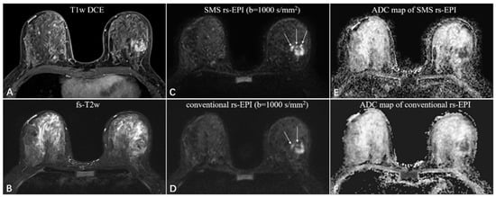 - Machida, Y.; Nomura, K.; Shimauchi, A.; Kato, Y.; Nagatsuka, M.; Fukuma, E. Diffusion-weighted imaging with simultaneous multi-slice echo-planar technique for the diagnosis of breast magnetic resonance imaging. Jpn. J. Radiol. 2020, 38, 358–364. [Google Scholar] [CrossRef]