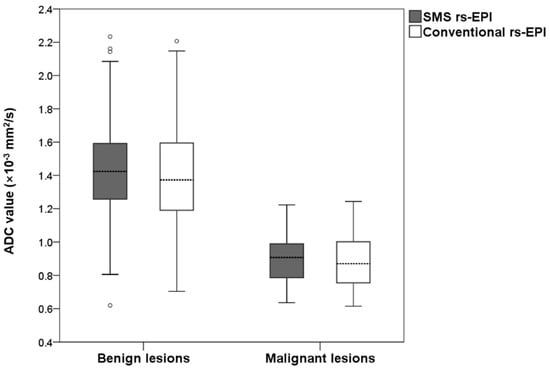 The measured ADC values for benign and malignant lesions are shown in Figure 5. The mean ADC of benign lesions in SMS rs-EPI was equal to those in conventional rs-EPI (1.43 × 10−3 mm2/s vs. 1.43 × 10−3 mm2/s, p = 0.717). The mean ADC of malignant lesions in SMS rs-EPI was the same as that in conventional rs-EPI (0.91 × 10−3 mm2/s vs. 0.89 × 10−3 mm2/s, p = 0.680). The inter-observer agreement was good for ADC values in both SMS rs-EPI sequences and conventional rs-EPI sequences (ICC = 0.861 (0.805–0.902) and 0.718 (0.615–0.797)).