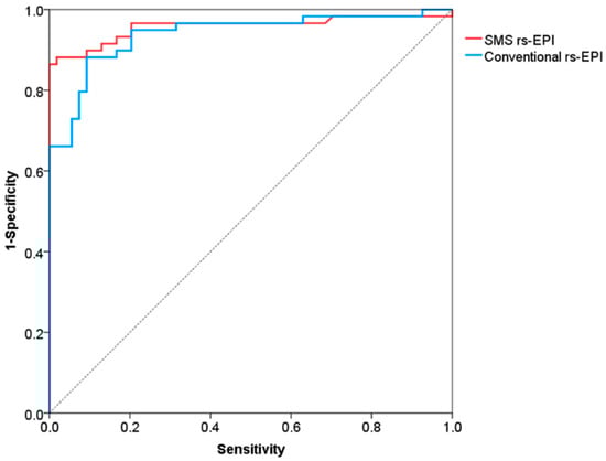 The ROC curves for differentiation of malignant and benign breast lesions in SMS rs-EPI and conventional rs-EPI are shown in Figure 6 and its corresponding AUC, cutoff, sensitivity and specificity are listed in Table 4. The AUCs of SMS rs-EPI and conventional rs-EPI were 0.957 (95%CI, 0.916–0.999; sensitivity, 0.86; specificity, 1.00) and 0.938 (95%CI, 0.894–0.983; sensitivity, 0.88; specificity, 0.91) (Table 4). The cutoff value of ADC to distinguish malignant and benign lesions was 1.22 × 10−3 mm2/s (sensitivity = 0.86; specificity = 1.00) for SMS rs-EPI and 1.14 × 10−3 mm2/s (sensitivity = 0.88; specificity = 0.91) for rs-EPI (Table 4).