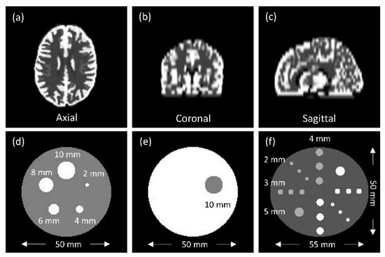 PHANbrain in (a) axial plane, (b) coronal plane, (c) sagittal plane, and the central axial slice of (d) PHAN5rod, (e) PHAN1sphere, (f) PHAN20rod.